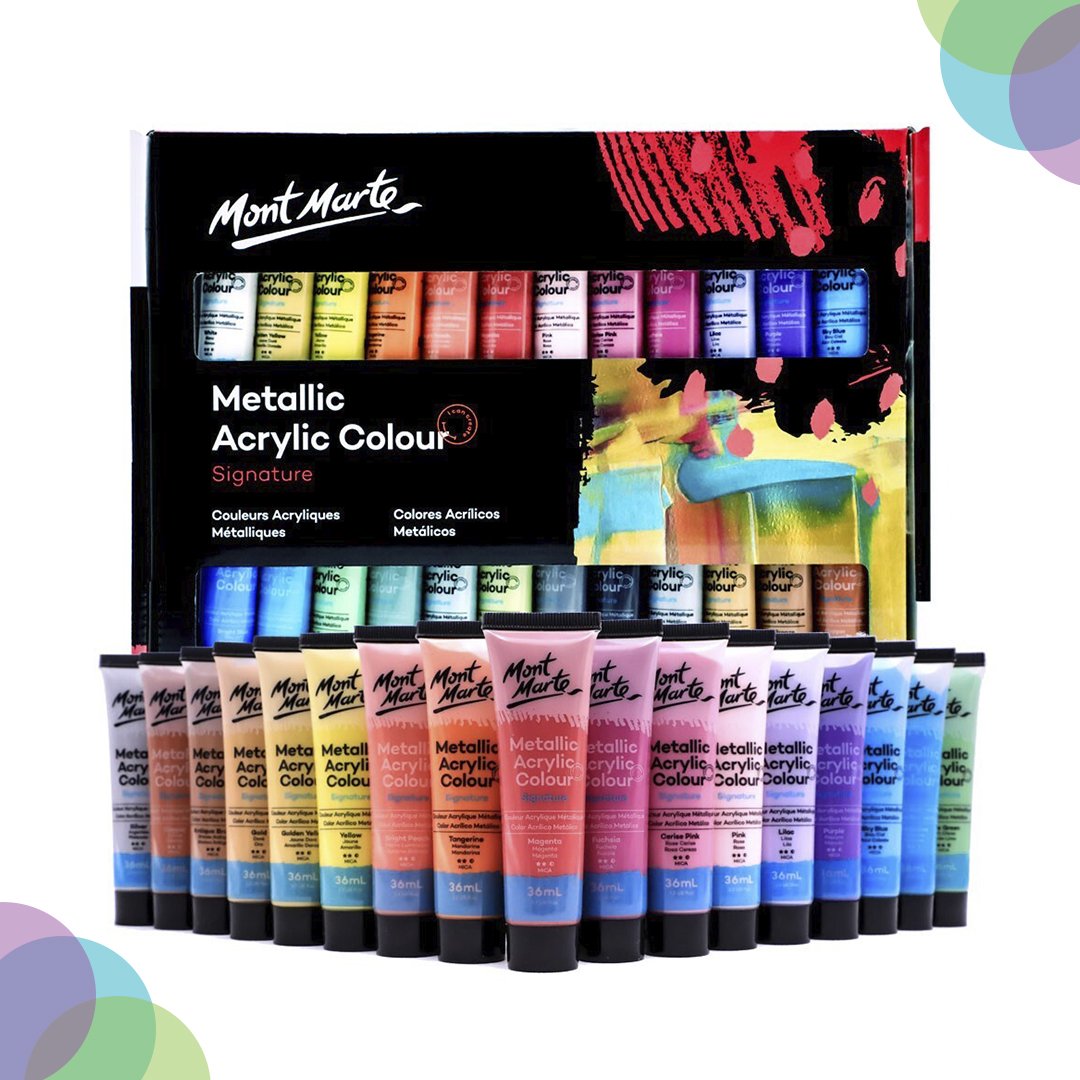 Mont Marte Metallic Acrylic Intro Set 8 x 18ML, Mont Marte Metallic Acrylic Paint Set 12 X 36ML, Mont Marte Metallic Acrylic Paint Set 24 X 36ML, Mont Marte Metallic Acrylic Paint Set 36 X 36ML, Mont Marte Metallic Acrylic Paint Set 8 x 36ML
